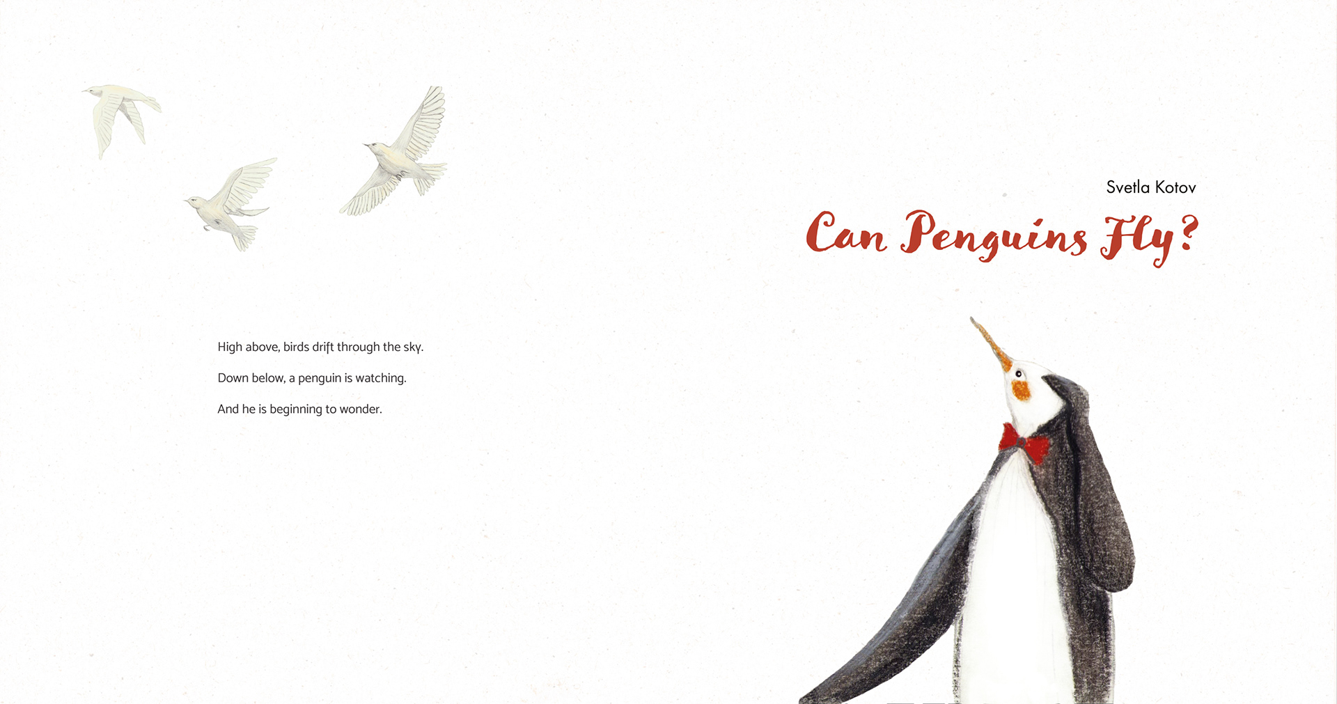 The penguin’s upward gaze creates a strong visual direction toward the birds, establishing a contrast between aspiration and reality.